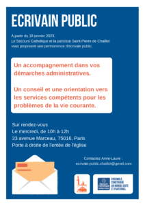 Une permanence d’écrivain public est ouverte le mercredi de 10h à 12h pour proposer un accompagnement dans les démarches administratives. Prendre rendez-vous par mail : ec**********************@***il.com