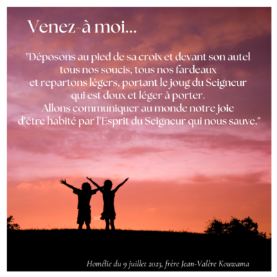 Venez à moi. C’est l’invitation que nous adresse le Seigneur en ce 14e dimanche du temps ordinaire. Le Seigneur nous invite à trouver auprès de lui la joie et l’Espérance. Il nous invite à vivre en lui la vie de l’Esprit. Et enfin, il nous invite à trouver auprès de lui le repos.  Triple invitation…